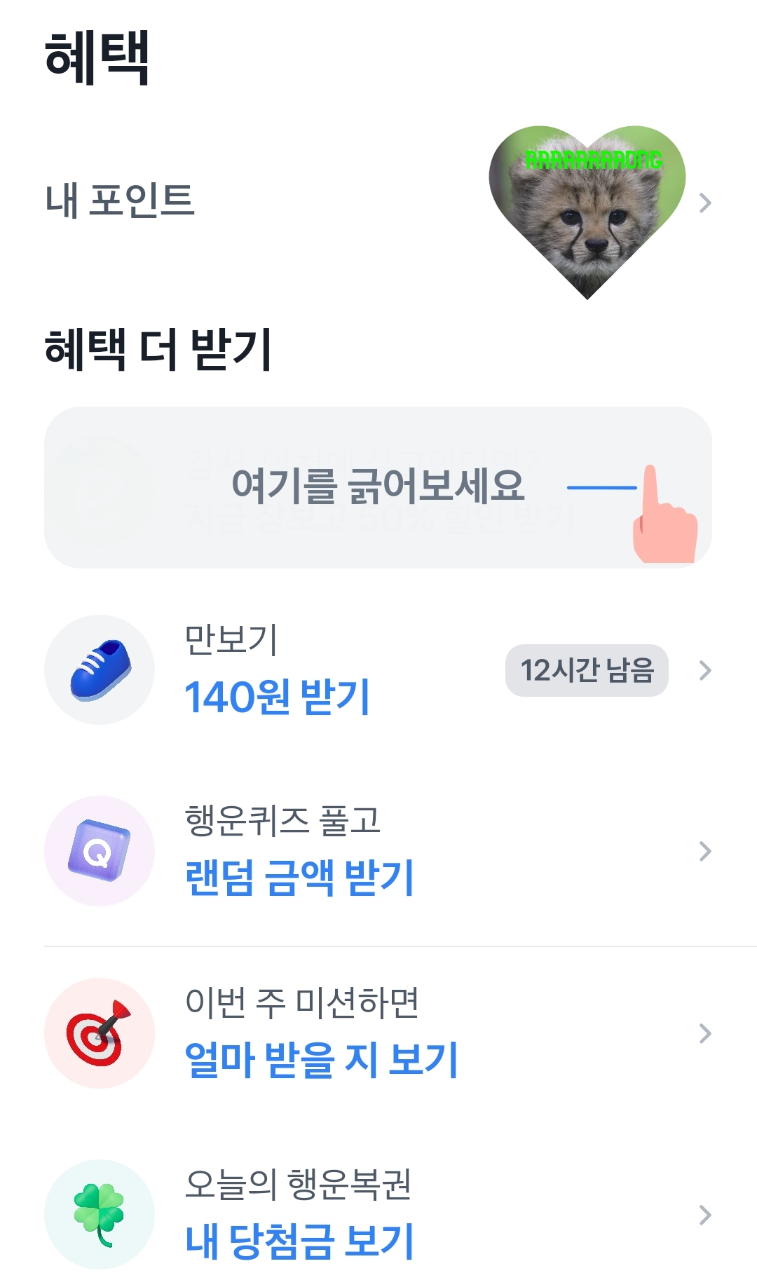 아래 사진에 나와있는 '여기를 긁어보세요'를 긁으면 적게는 2원, 많으면 5원 정도까지 나온다. 아, 4원인가? 이거 말고도 행운복권이라는 게 있다. 행운복권은 재물운 성공운 애정운 중에 하나를 고르면 오늘의 메시지와 귀인의 초성이 나온다. 그건 반쯤만 믿어도 되는데 날마다 출석체크하듯이 복권을 긁어 당첨금을 받으면 3배 이벤트 2배 이벤트도 하니까 빼먹지 않고 하는 게 중요하다.